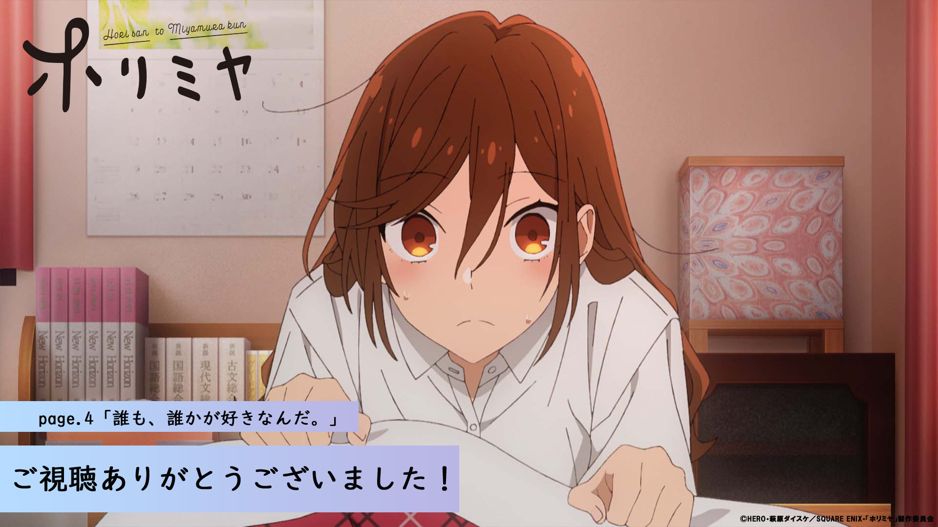 Everybody Loves Somebody (「誰も、誰かが好きなんだ。」 'Dare mo, dareka ga sukina nda.'?) is the fourth episode of the Horimiya anime.